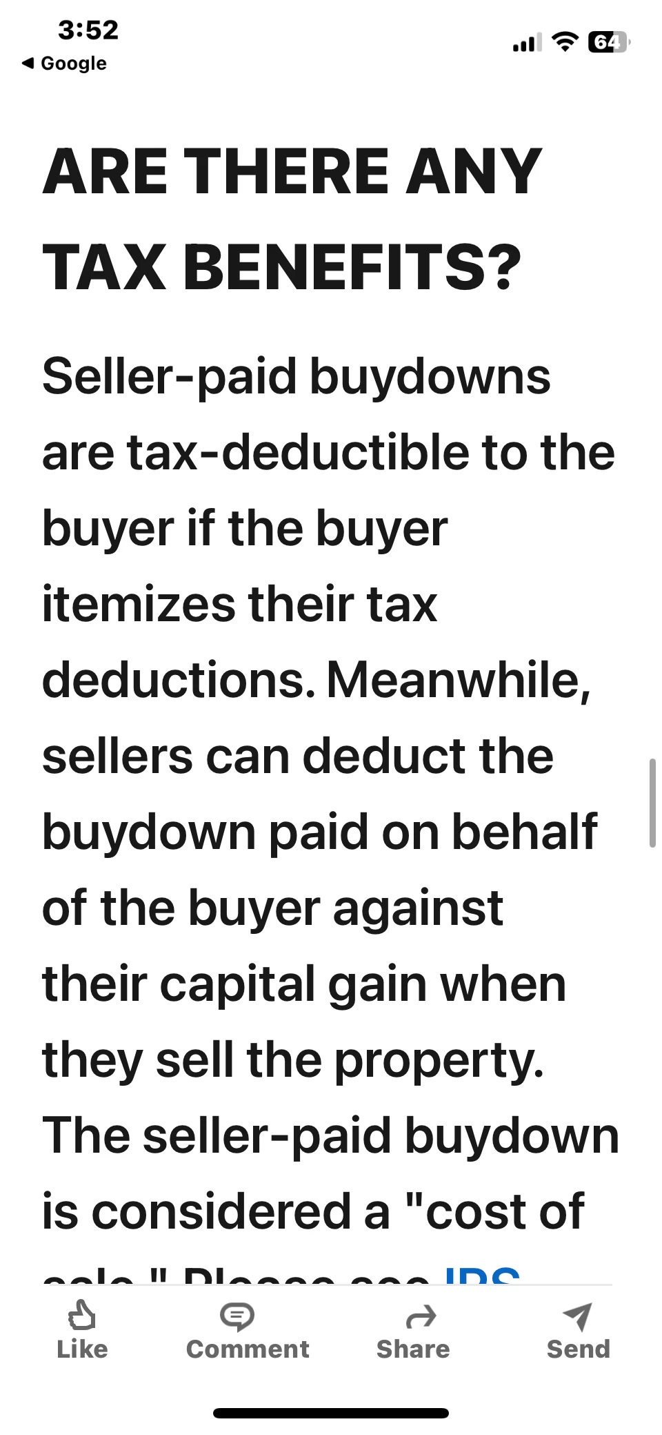 Seller paid for temporary 2-1 buydown fee to lower our interest payments for the first 2 years. It was listed in Section A of the Closing Disclosure. This amount is deposited in escrow and a fixed amount is applied to interest payment monthly. Is the seller paid buydown fee deductible?