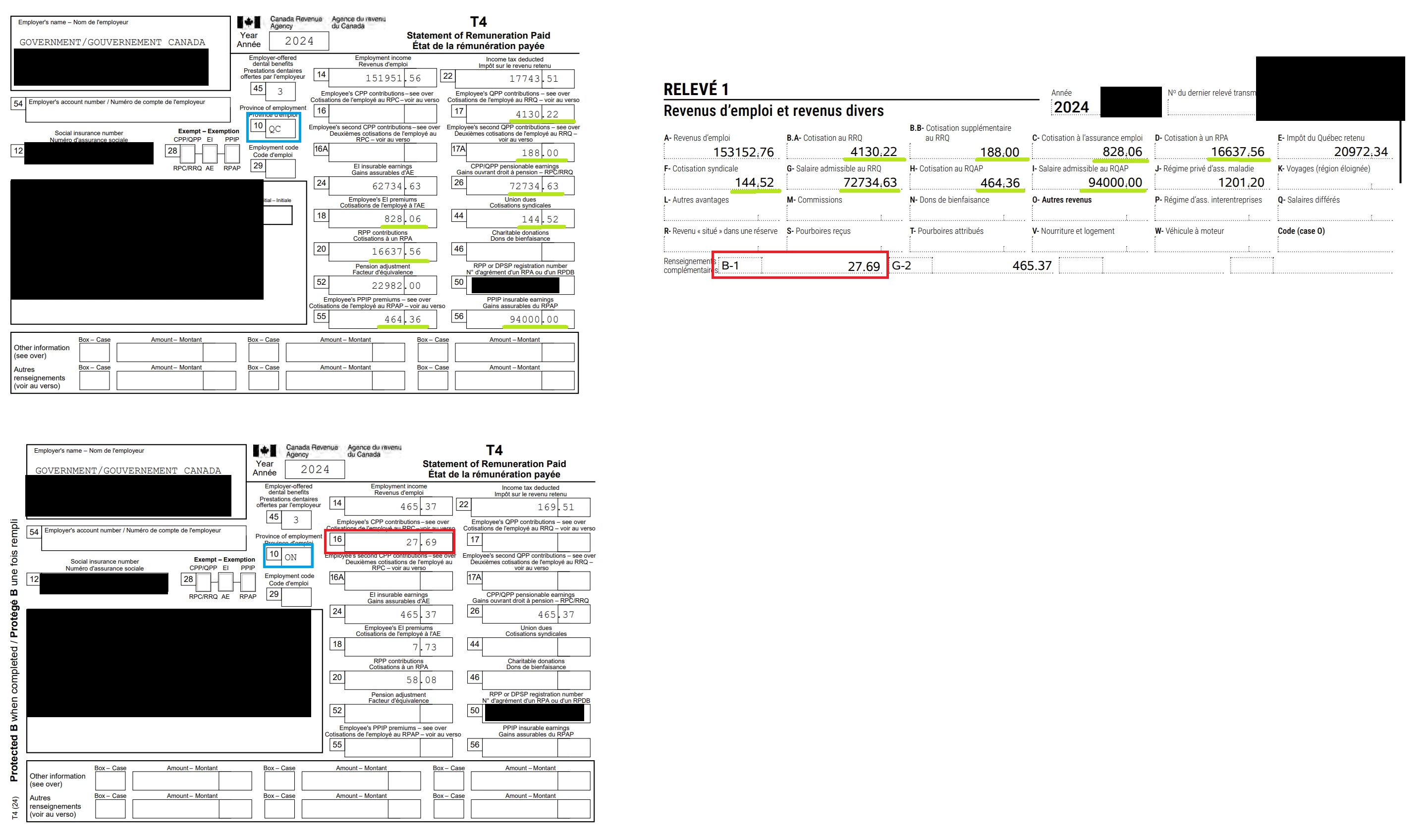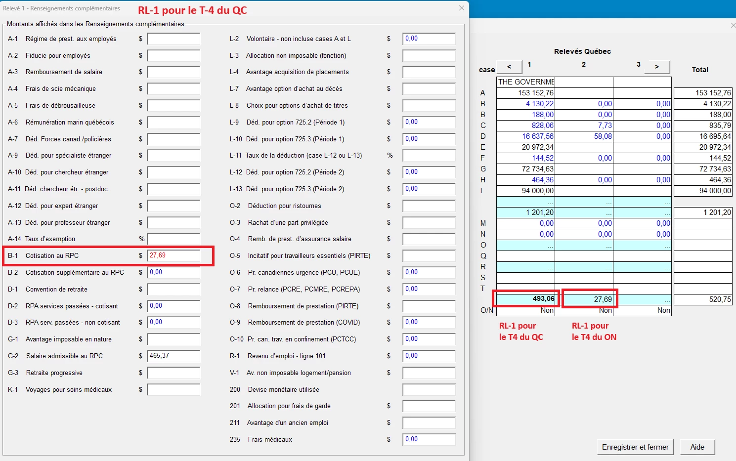 En inspectant les formulaires, je vois qu'un RL-1 a été créé automatiquement par le logiciel pour le T4 de ON (le relevé de droite sur l'image). Ce RL-1 ne contient que des valeurs aux champs C, D et B-1 (le 27.69$ dans la boite bleue).