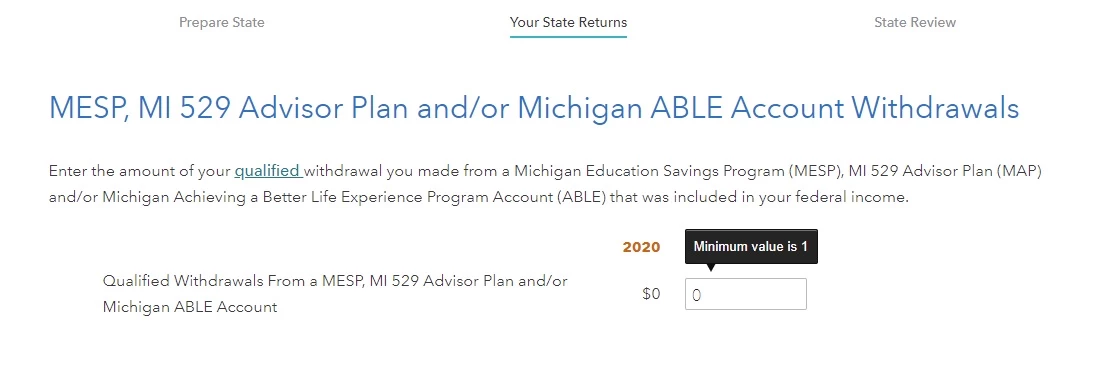 But, now I am doing my MI state taxes and in Schedule 1 and TurboTax is asking me to fill in an amount for line 21, which asks "If any amount of a qualified withdrawal was included in your gross income you should enter that amount on this screen." NONE of my qualified withdrawal was included in my gross income, but I am blocked by TurboTax from putting in $0. It forces me to at least have a minimum value of $1.