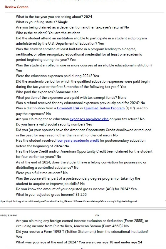 I am a bit confused as I thought that answering - No, my earned income provided less than half of my support, would disqualify him for the AOC credit, but TT is increasing his Federal Refund regardless.