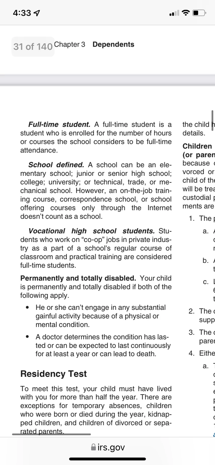 I am 20 years old mother, living with my father. I currently make around 10,000 a year. I also am in school full-time, but the classes are all online. I read on the IRS website, that you can be 24 and under in college, as long as you were in person and the courses weren’t only online. I am not sure what to make of it. I will try to add it in as a picture or link. I went to Elgin Community College, so I’m not sure if the college I went to makes a difference.