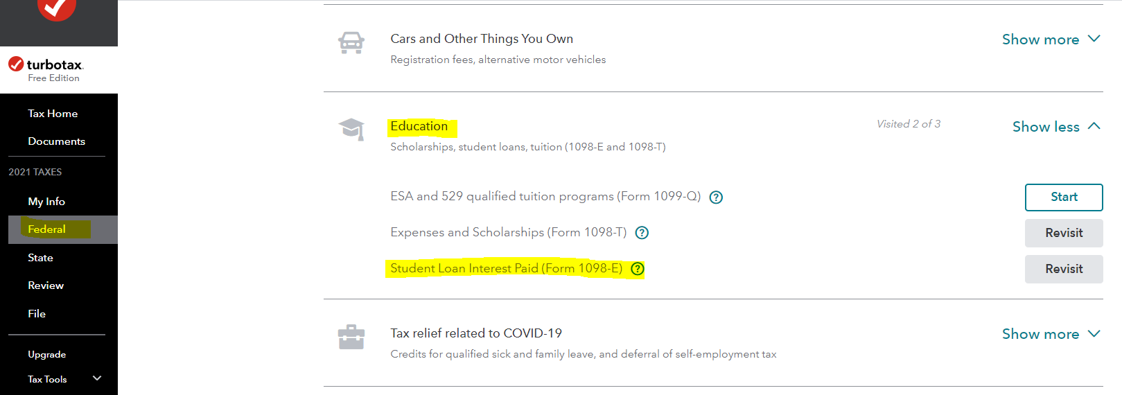 3) Scroll Down and you will see a Section "Education". Within that section, please click the start button next to Student Loan Interest Paid.