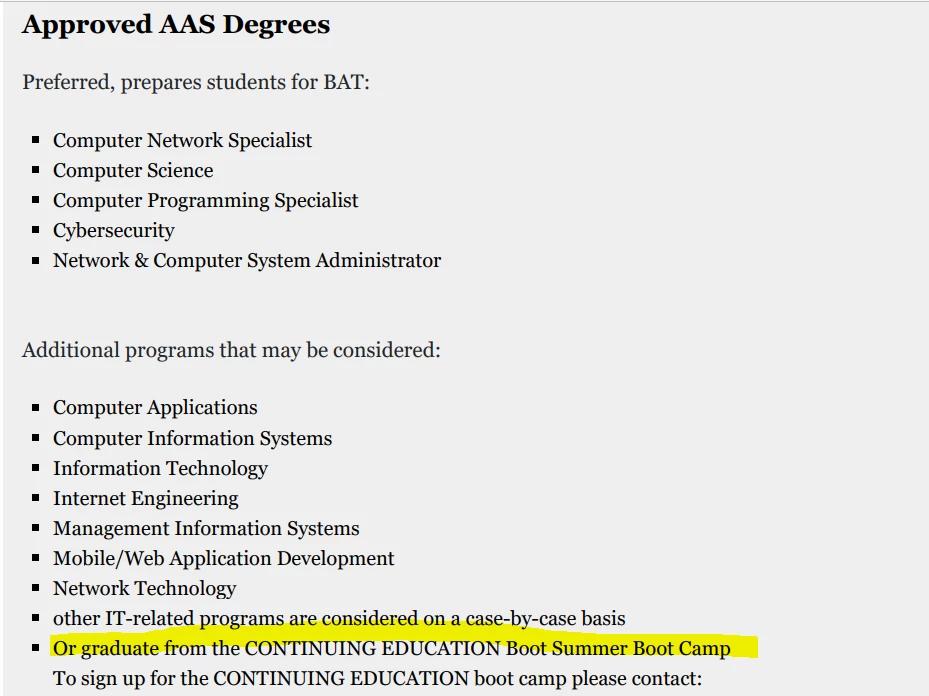My college required me to take a Continuing Education Bootcamp that they were offering before I could be accepted into a Bachelor's Cybersecurity program. Their reasoning for this is because the 2 Associate degrees that I already held were not listed on their list of "pre-approved AAS degrees".