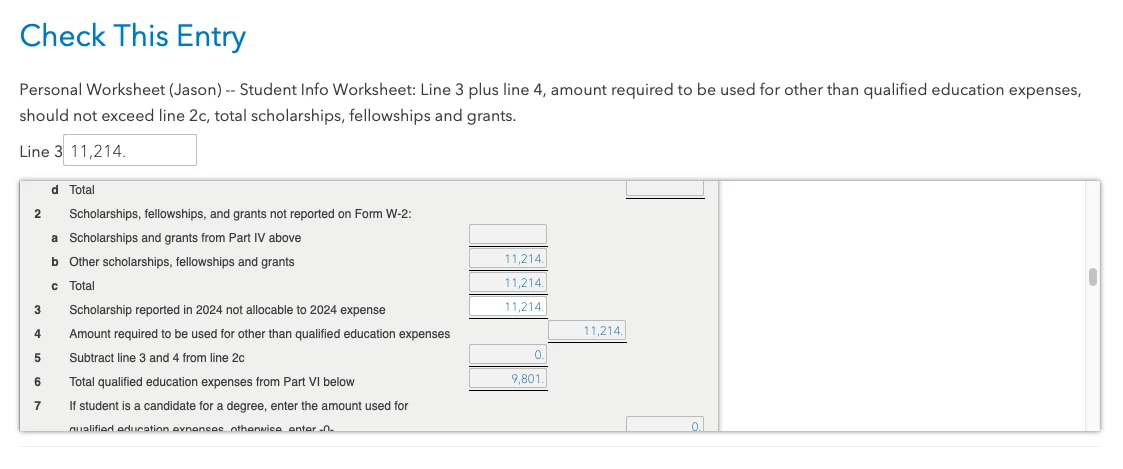 • When asked if any scholarship wasn't for education expenses, I entered "Yes" and put $11,214