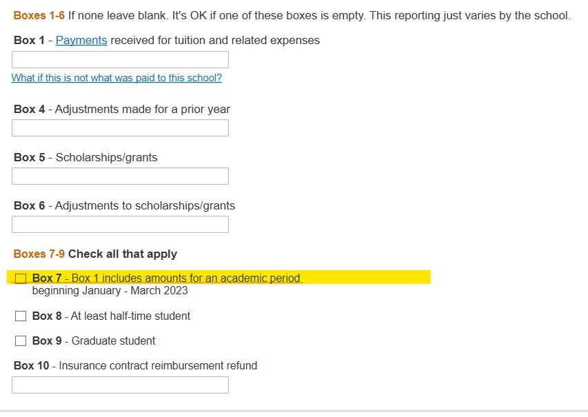 I am in the entering information. I need to click 8 and 9 but leave 10 blank. When I do this, I get a fix errors message. I have even unclicked all, tried different variations, nothing is working. This is for my 2022 1098-T form