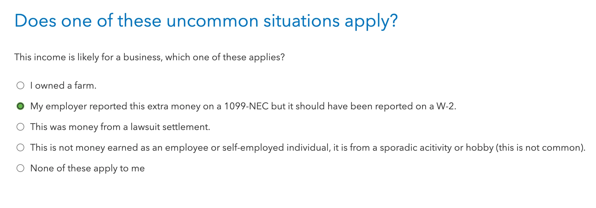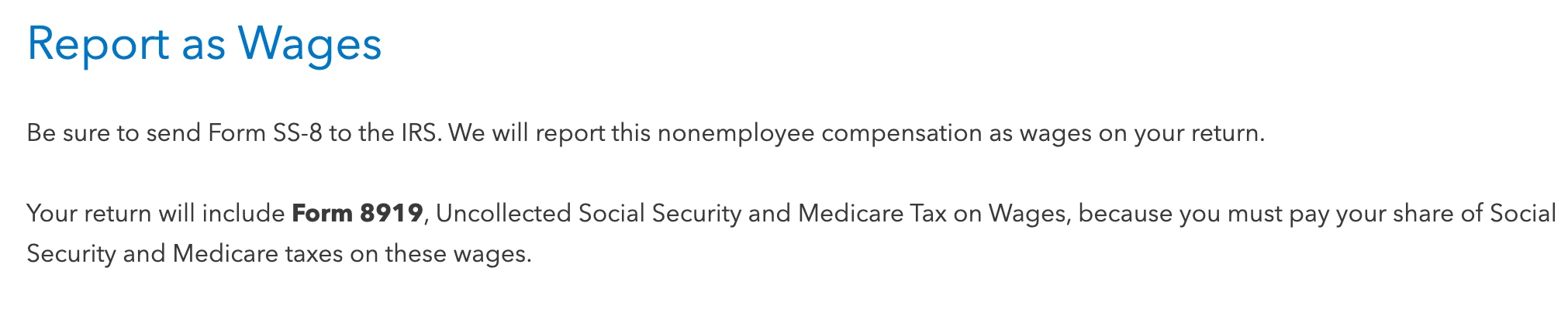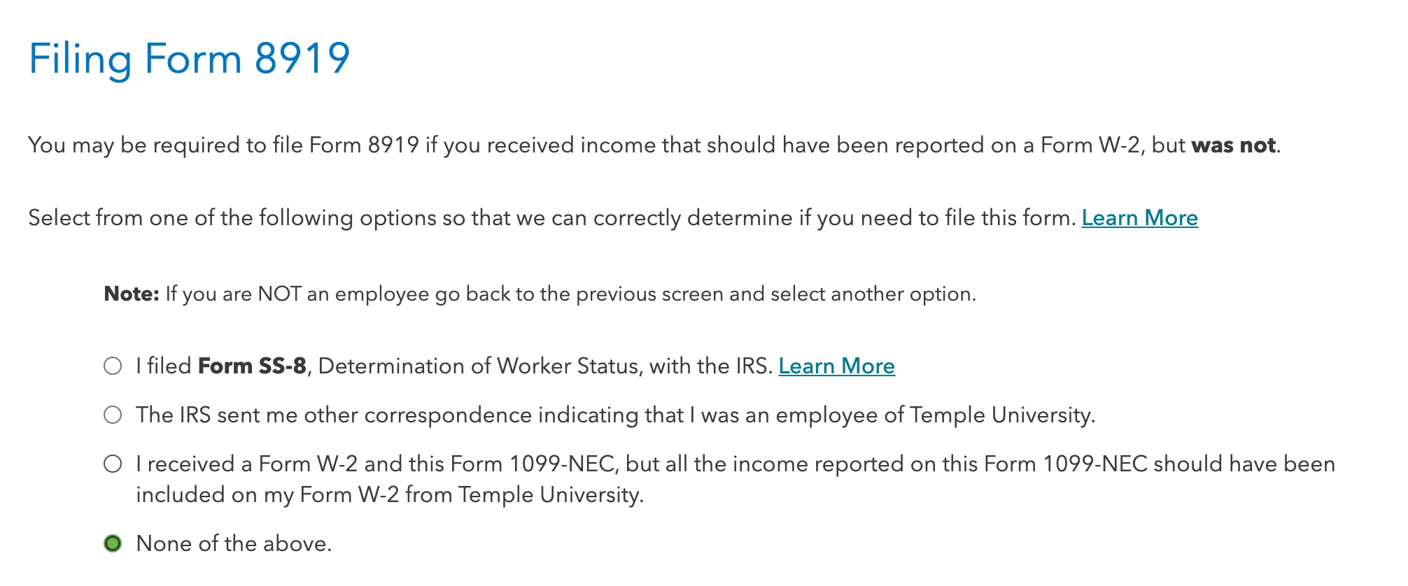 2) Selecting "My employer reported this extra money on a 1099-NEC but it should have been reported on a W-2." and then going to the "Filing Form 8919" page. If so, should I have filed a Form SS-8 prior to today? I have attached screenshots below.