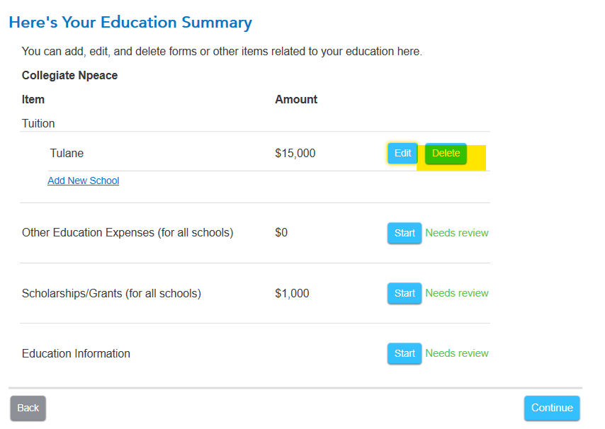 1. You should delete the college information that is no longer in use and add this year's college to the program. Return to the education section to make these changes. Edit your education summary and then either: