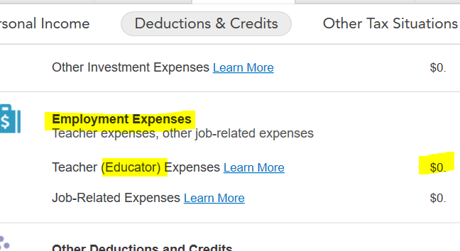 It is in the Deductions and Credits section and it is titled Teacher (Educator) Expenses. It is part of Employment Expenses, see below.
