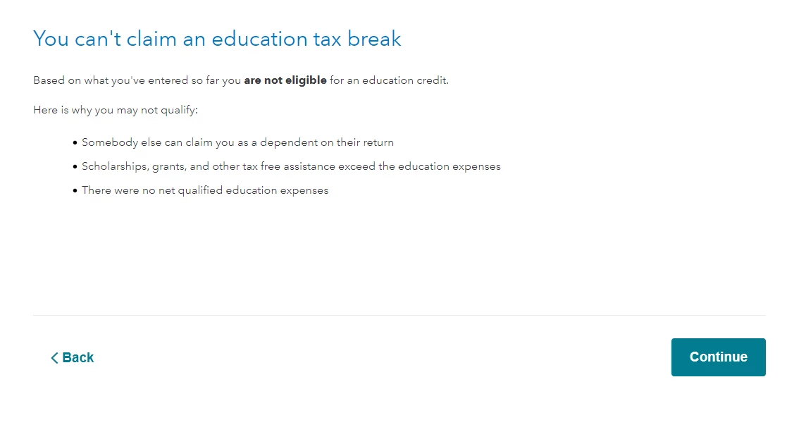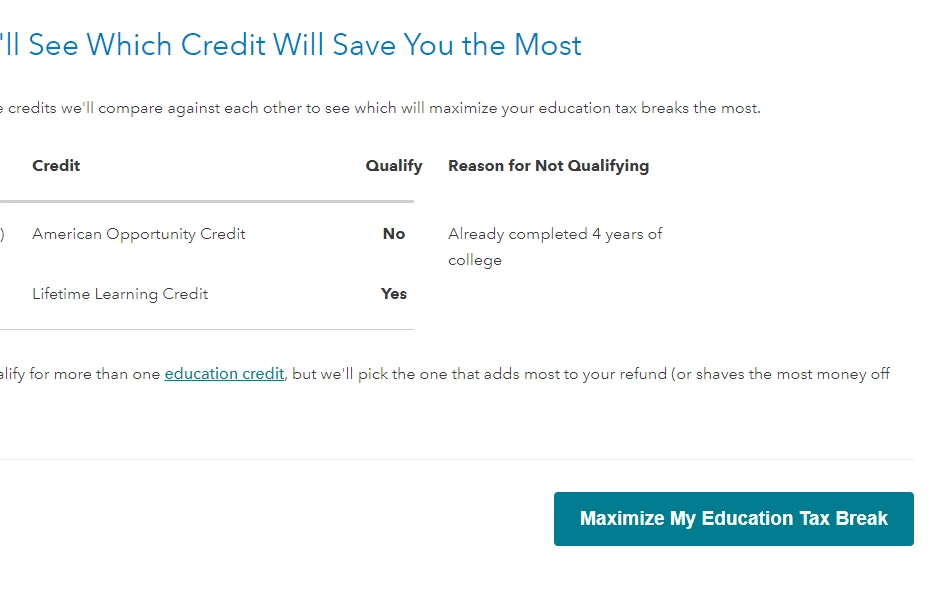 It says I am qualified for Lifetime Learning Credit and when I click on 'Maximize My Education Tax Break' it disappears and says I can't claim LLC in the next page. I am filing as taxpayer myself and check that no one else can claim me as dependent and I didn't receive scholarship.