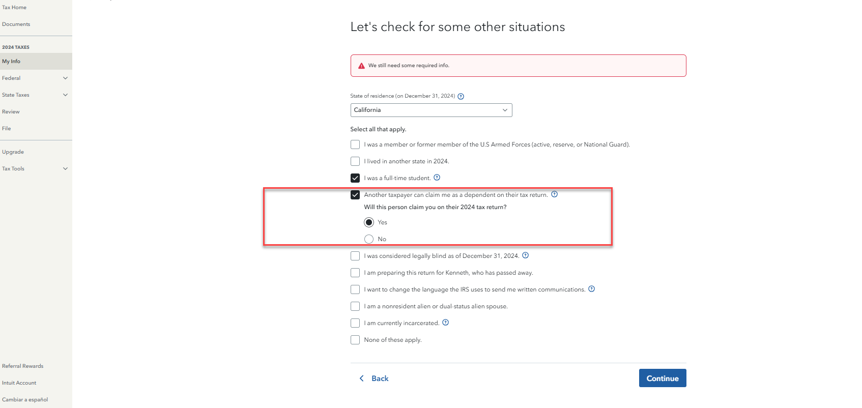 In order to ensure TurboTax is not allowing you to claim yourself, make sure you have answered all the questions in "My Info".