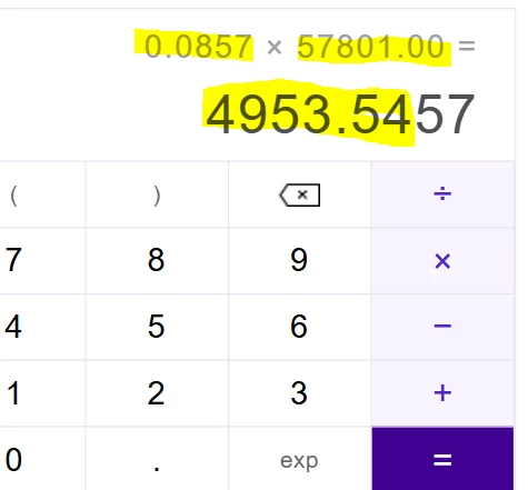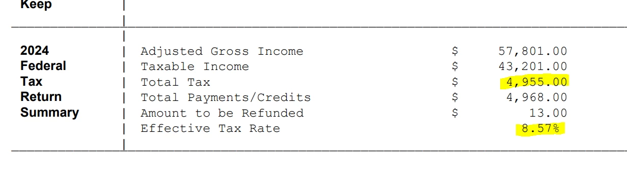 In my Turbo Tax summary, it lists the blended tax rate as 11.5% and then on the actual return, Turbo Tax writes the effective rate is 8.57%. If total gross income is $57,801.13 and tax withheld was $4968.06 (with standard deductions 14,600 and no credits), then all my math is coming to $4953.56 as my total tax liability owed. But TurboTax is listing $9555 as my total tax owed - how are they calculating this number? (Even If you calculate the total taxable income (subtract the standard deduction) and multiply by the other blended 11.5% rate they showed it’s a totally different number ($4968).