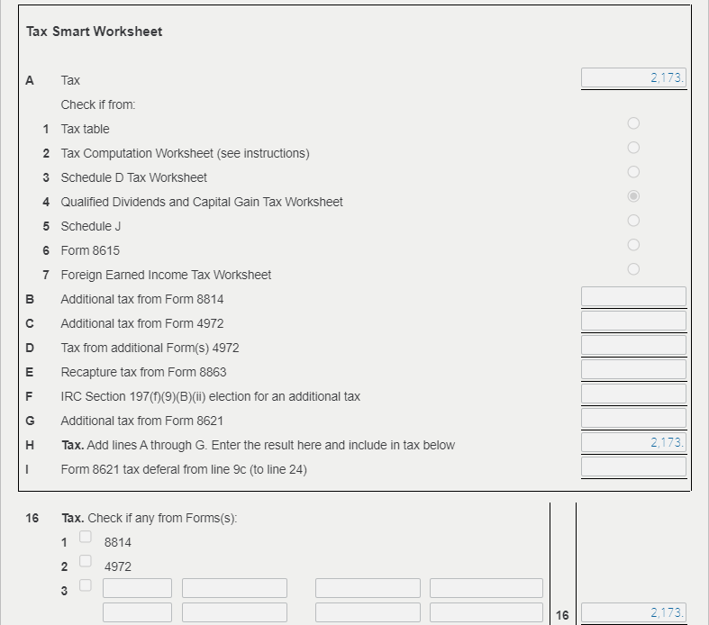 The image below shows the smart worksheet for a return where the Qualified Dividends and Capital Gain Tax Worksheet was used to calculate the tax.