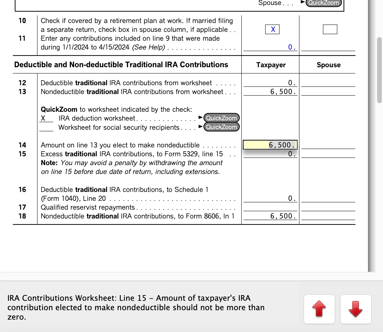 Did you mean to say "non-deductible" here instead of deductible? Basically, it looks like I just need to change Line 14 to 0, right? That is what Turbo Tax is suggesting. Meaning that the non-deductible $6,500 is already covered by my work retirement?