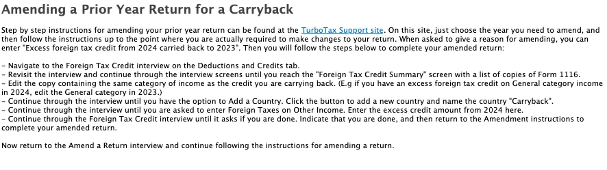 When I get to the excess foreign tax credit part of easystep, there is a hyperlink to learn more. This leads me to the "How to carry back the excess foreign tax credit" helpfile. Now I click on the "Amending a prior year return for a foreign tax credit" hyperlink, and that gives me the screen below.