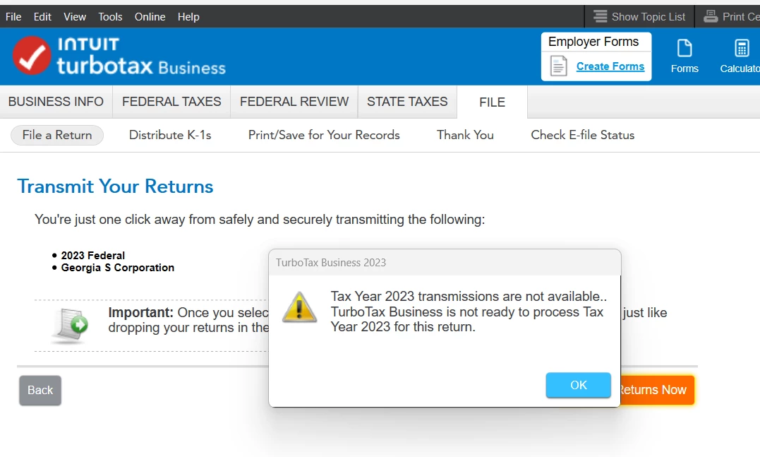 "Tax Year 2023 transmissions are not available. TurboTax Business is not ready to process Tax Year 2023 for this return."