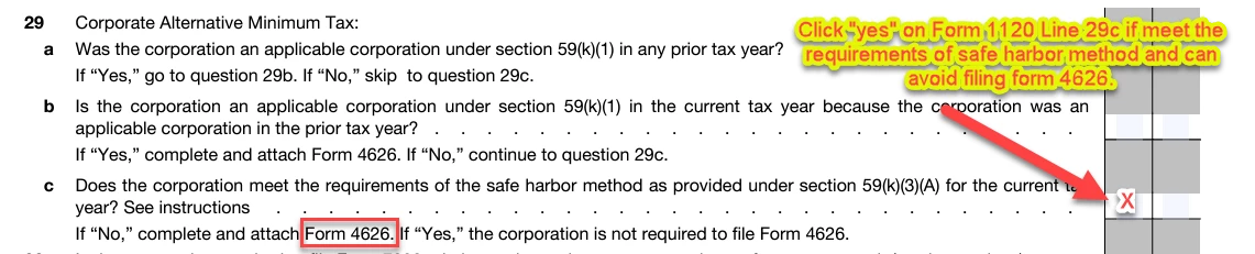 If taxpayer qualified for safe harbor method (most corporation may qualify), they can click the "yes" box on Form 1120 Sch K Line 29c to avoid filing Form 4626.