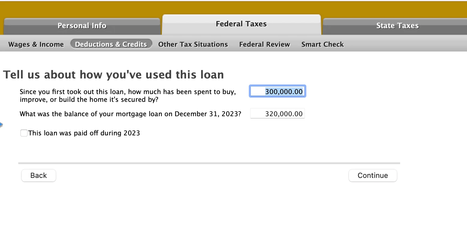 Basically, it's not clear to me in this "Tell us about how you've used this loan" screen what to enter in the first highlighted box, either the starting amount as the home acquisition debt as a constant essentially over time, or should it be changing as a ratio (in this case 75%, which in this particular example would be 240,000?) of the "balance of your mortgage loan" in the box below?