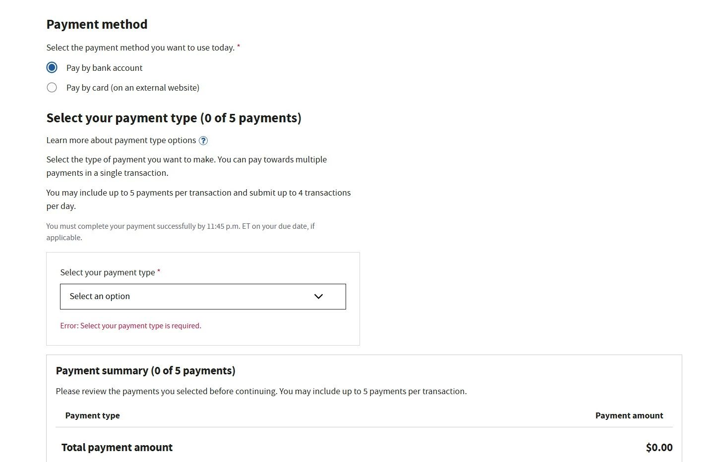 I didn't really understand how to do multiple payments by different methods. On my online account with the IRS - I need to first pick a payment method (bank or credit card ) and then can split it to 5 payments ... but still all 5 will be of that same method , right ? it says : "You may include up to 5 payments per transaction and submit up to 4 transactions per day."