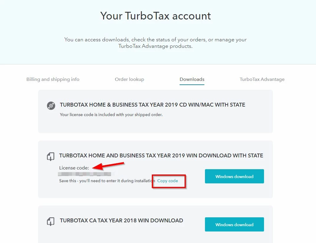 This is my Turbo Tax download page from 2019 showing where the License Code is