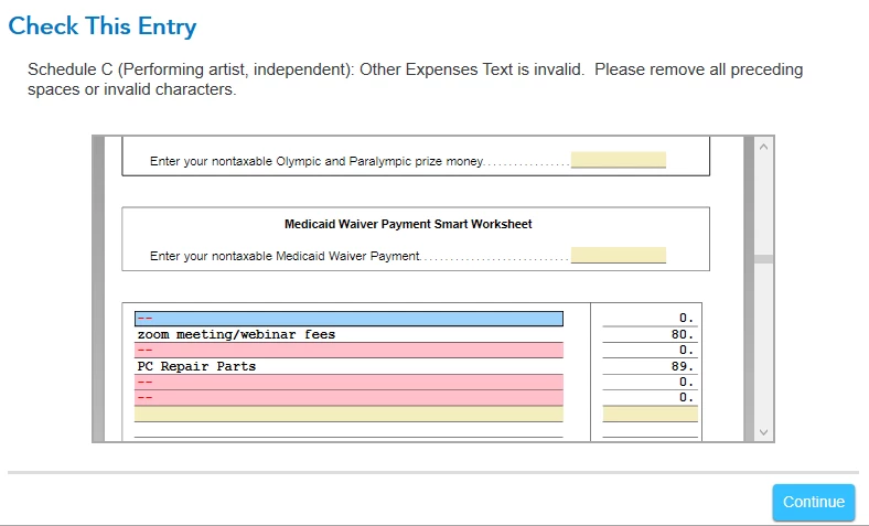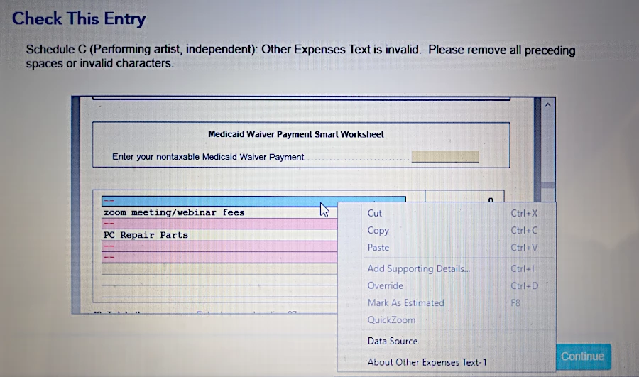 I can't edit some entries in the Home & Biz 2024 Schedule C worksheet (downloaded version). The fields involved are highlighted in red/blue below. The "Smart Check" review kept stopping on this worksheet indicating there was an error. These fields were originally empty and highlighted in red. I entered the "--" and zeroes in an attempt to try and clear this error, but that just made it worse, as now I can't change or delete anything in these fields. All "Edit" options in the top menu are grayed out and/or appear to be non-functional. The issue is the same in both Step-by-Step & Forms view:
