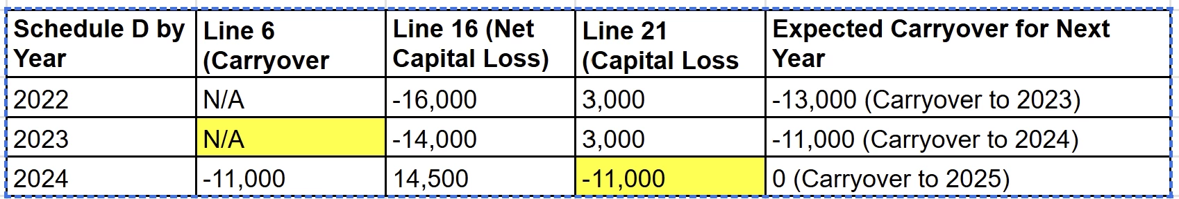 - In 2023, I reported a total capital loss of $14,000 on Schedule D line 16, and after using $3,000 of that loss, which again is recorded on line 21, I ended with a carryover of $11,000 to 2024.
