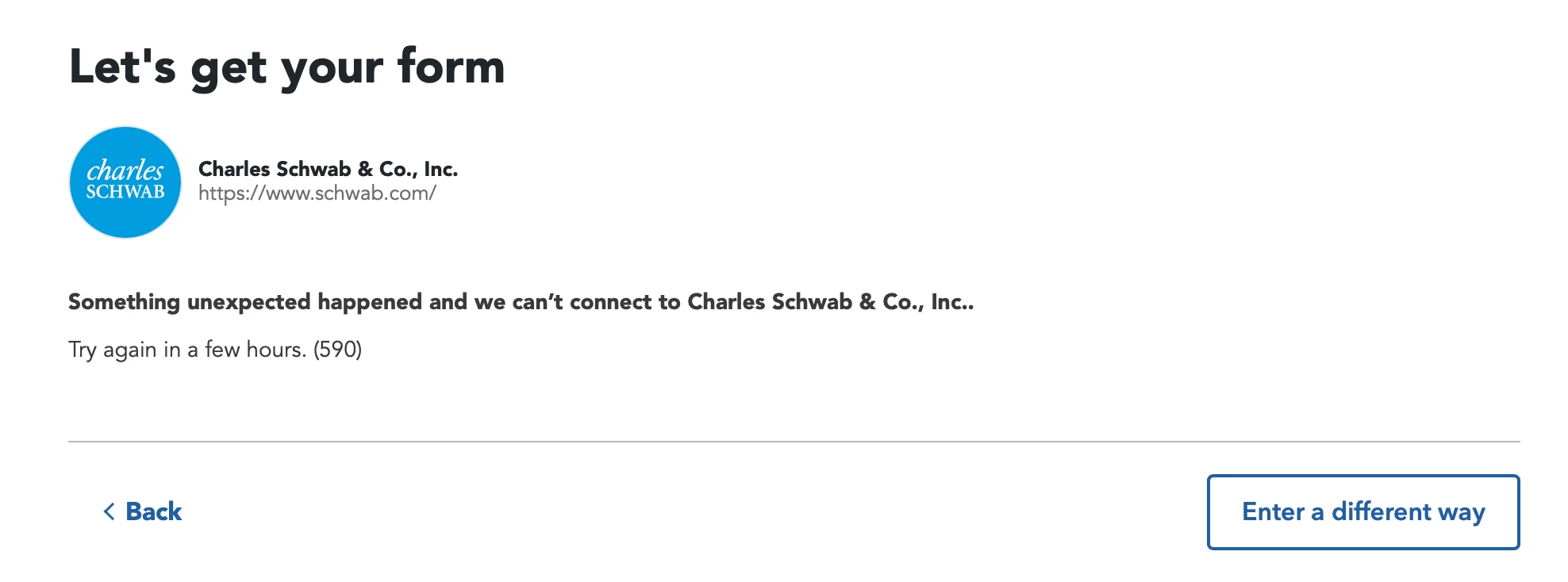 I'm trying to import my data from Schwab and keep getting a generic error message saying "something unexpected happened". I have been trying for a few days and keep getting the same error. I don't have any issues importing from Chase and Wealthfront. I tried Safari and Chrome and get the same error. Any idea what's going on and how to fix this?