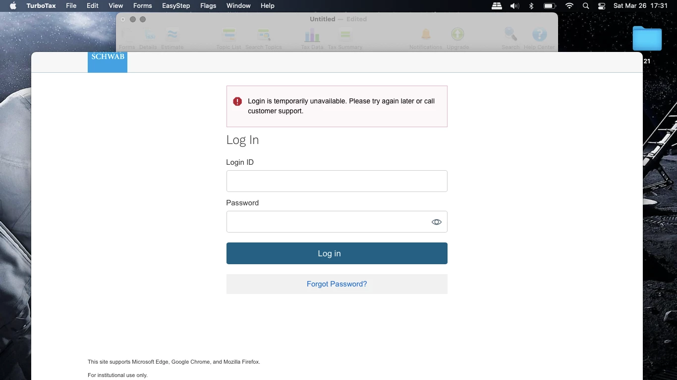 But when I try to import Charles Schwab forms Turbo Tax Premier (desktop -mac) shows this message below in the screen "Sign on to Charles Schwab & Co., Inc" before even prompting me to enter my login info. There's nothing wrong with internet connection and I am able to import other forms. Please let me know what I may be missing. Thank you.