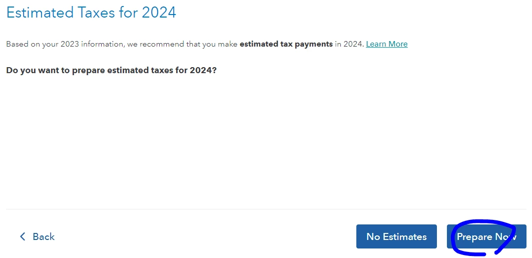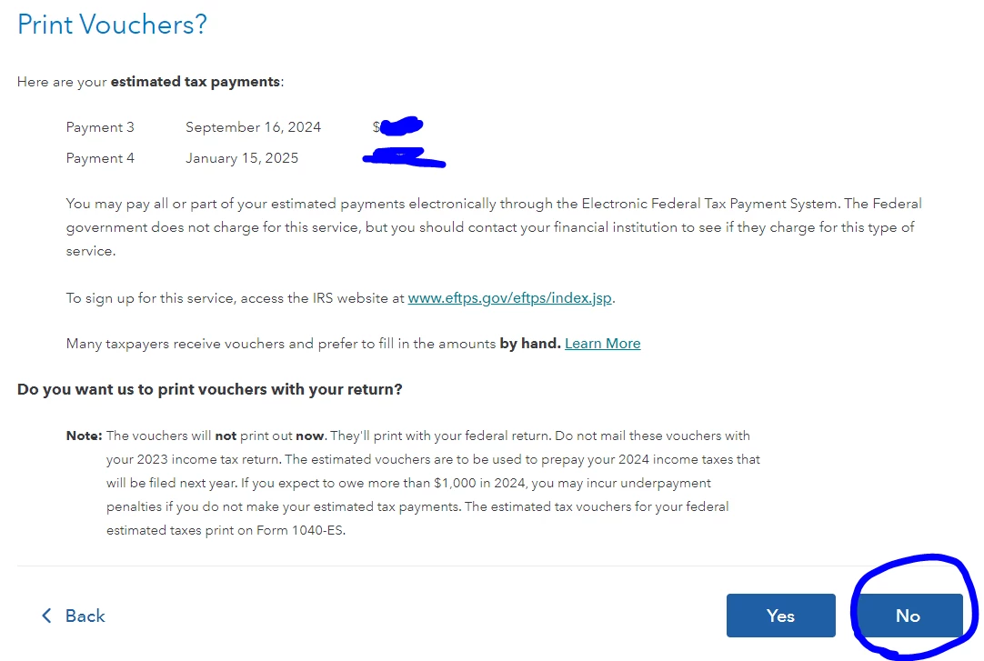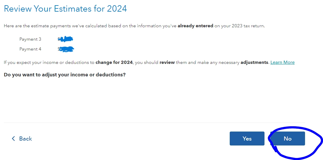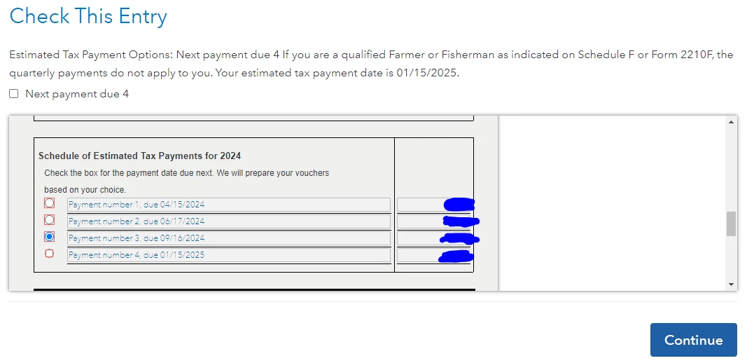 I am in the last step of filing my individual tax form (1040) and stuck at "Check This Entry: Estimated Tax Payment Options".