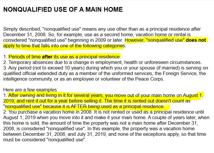 1. After owning and living in it for several years, you move out of your main home on August 1, 2019, and rent it out for a year before selling it. The time it is rented out doesn't count as "nonqualified use" because it is AFTER being used as a principal residence.