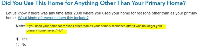 Did you use this home for anything other than your primary home? What do I choose in my below case?