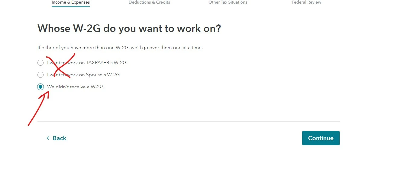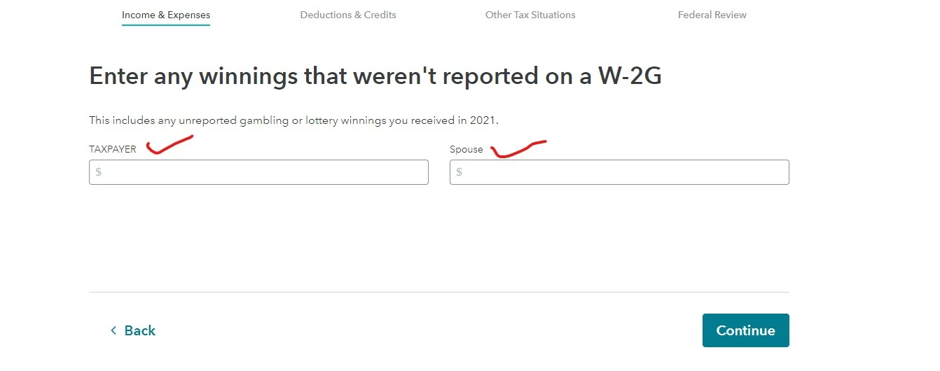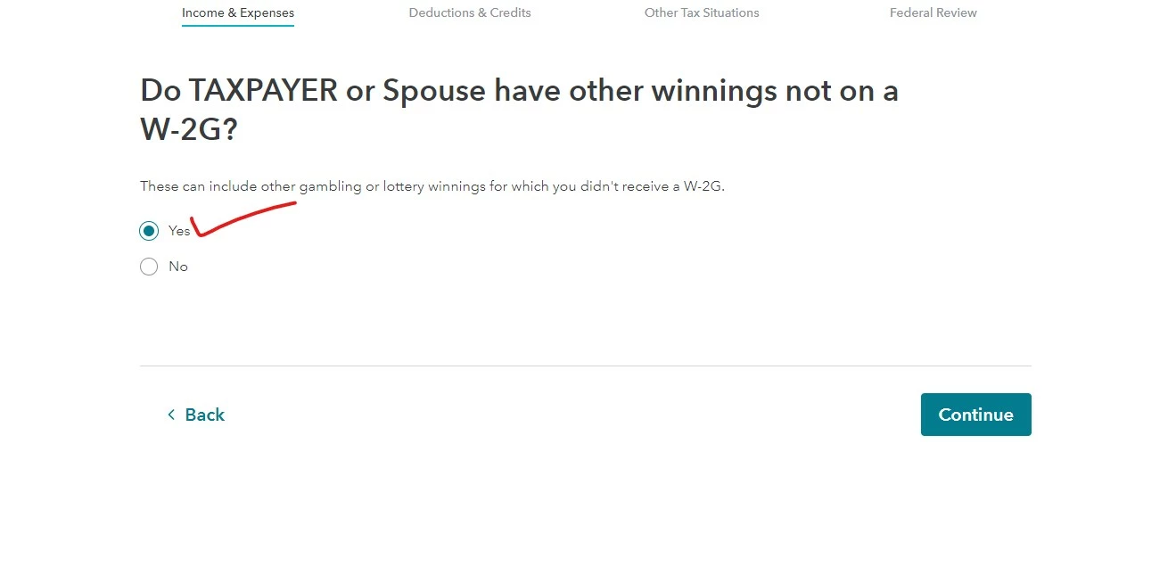 5. Answer "Yes" on the Gambling Winnings screen and follow the instructions to enter your W-2g.