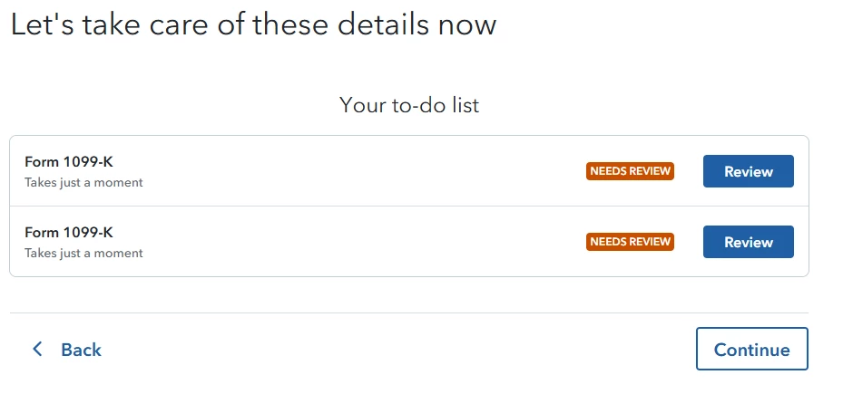 Also, each of the links in the Review below take me to the same listing of my 3 1099-ks. AND no matter which 1099-k I click on, it only shows the data for the first 1099-k. I also had to use the menu links to navigate to the other 1099-ks.