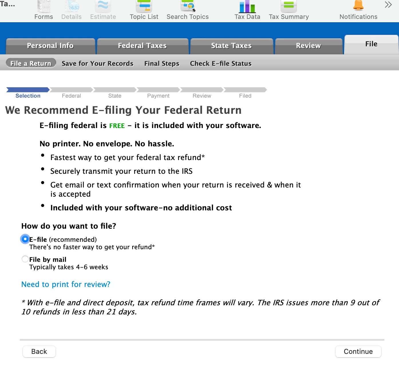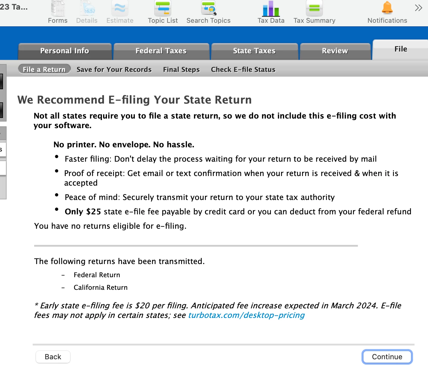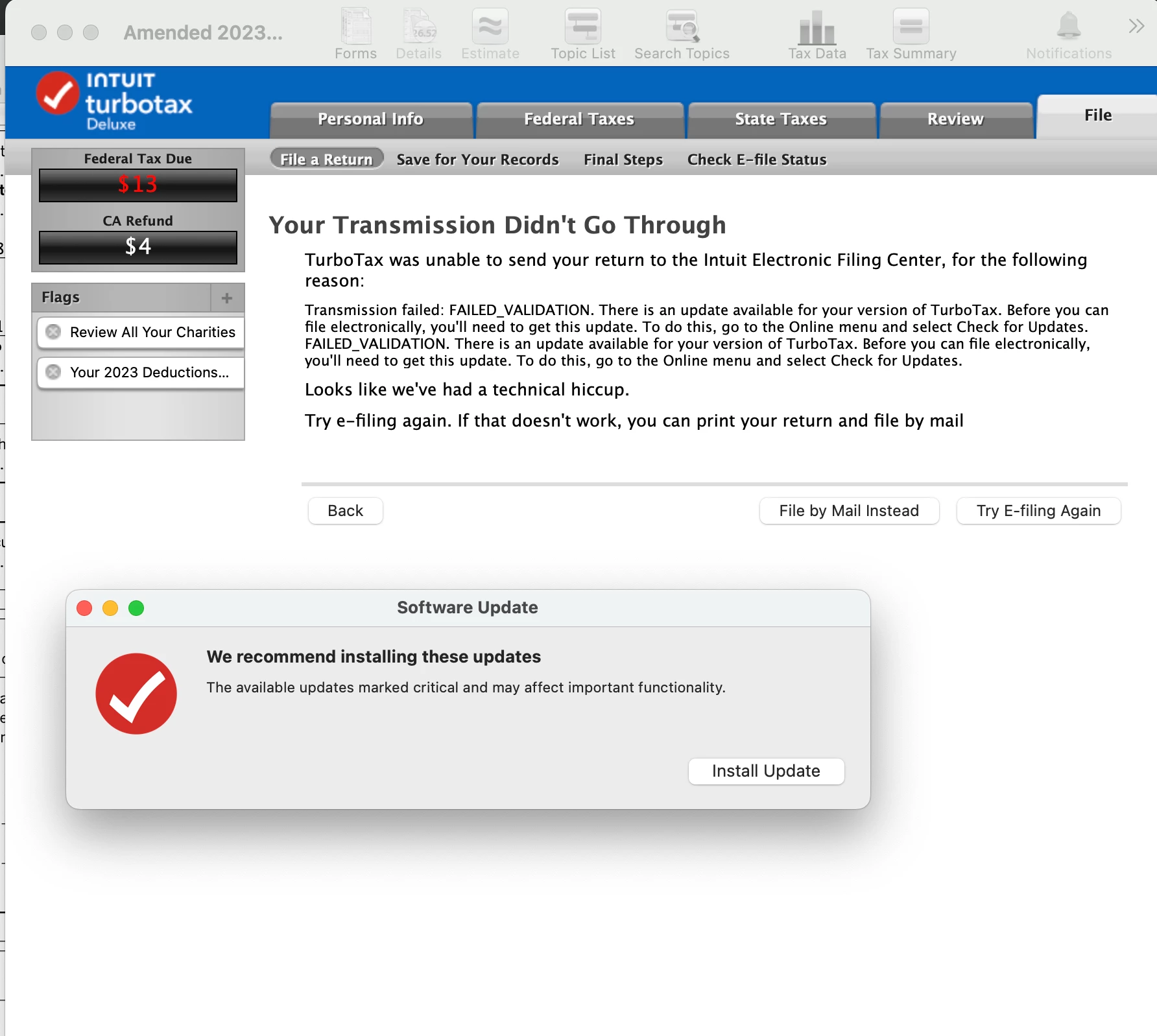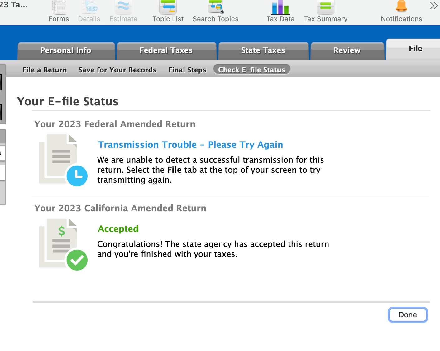 My Issue: I successfully e-filed my California amended return and it was accepted the same day. However, my Federal amendment cannot be transmitted via the application because of some type of transmission error specifically having to do with Macs. On my first attempt, neither federal nor state were transmitted, but after updating the software, the state went through. Then after restarting my computer, I encountered a new issue where the application began cycling between the "We Recommend E-Filing Your Federal Return" and "We Recommend E-Filing Your State Return" pages. The phone representatives don't have a solution or work around to proceed with e-filing (not their fault).