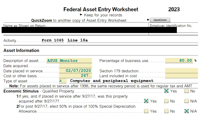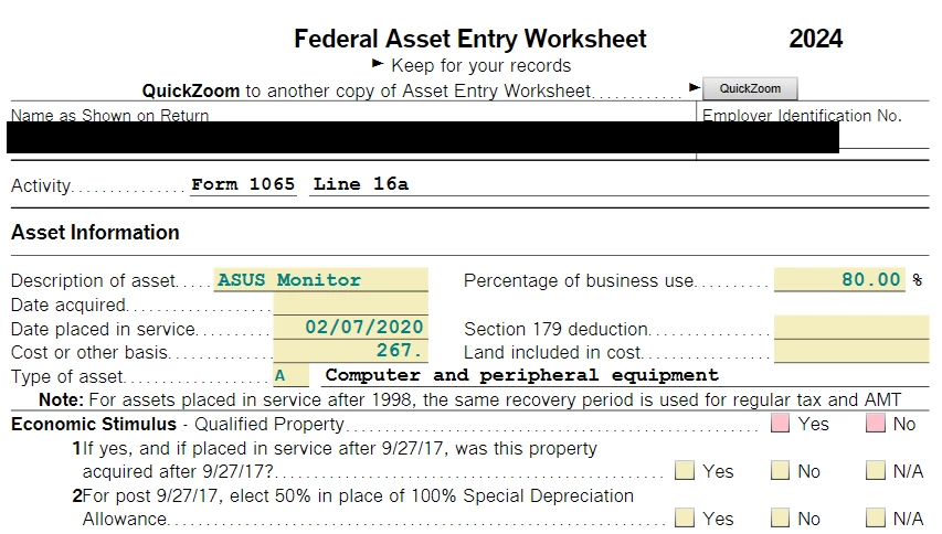 I used to use TT business to create tax return Form 1065. For 2024 I transferred data from 2023 file. This will be the final report and I disposed the properties. At Federal Review\Error check, there were many errors on Federal Asset Entry Worksheet starting with the checkbox "Economic Stimulus - Qualified Property" because neither "Yes" nor "No" was checked.