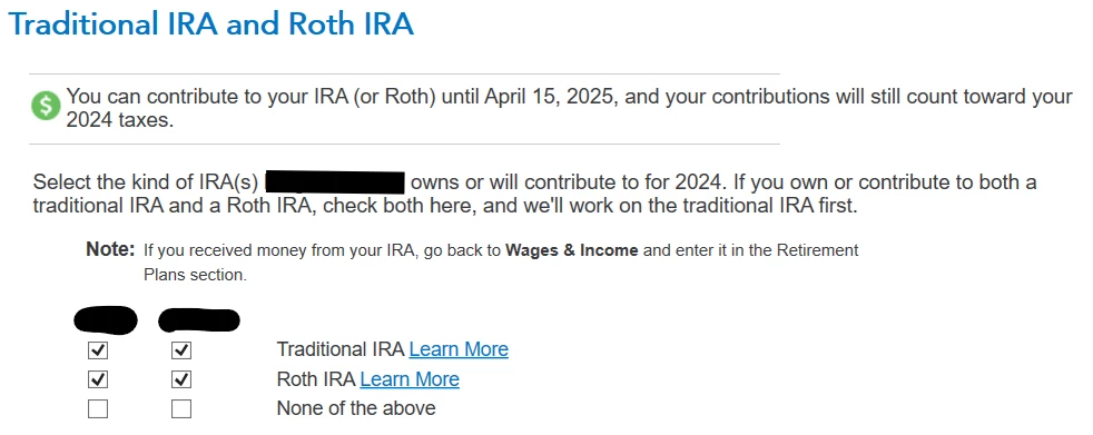 In Deduction & Credits, under Traditional IRA and Roth IRA, how should I move forward? As below, do I check both Traditional IRA and Roth IRA?