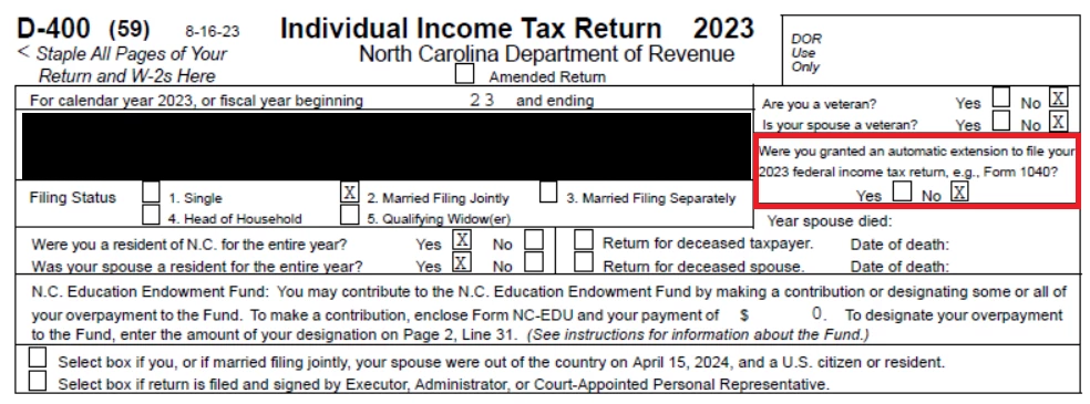 I just finished up my taxes, and I found something during my final review. On my NC State tax form, there is a question "Were you granted an automatic extension to file your 2023 Federal income tax return, e.g., Form 1040?".