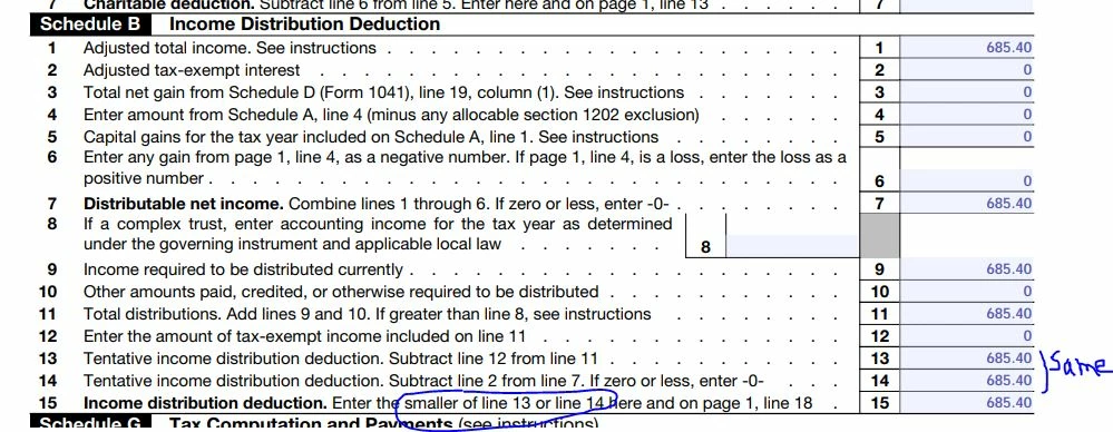 I did my own taxes with TT but I have to file for a Trust by paper as I don't want to buy TT Business for such a trivial return. When I fill out Schedule B on the 1041 to the best of my ability, and get to Line 15, it says to enter the smaller of Line 13 or 14. They are both the same on my form. Makes me wonder if I'm doing something wrong. Thoughts? I would appreciate a quick look at this. Thanks.