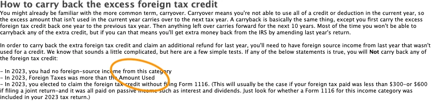 I have an excess foreign tax credit for 2024. Desktop Turbotax H&B tells me I might need to file an amended 2023 return for a carryback, subject to some conditions. My question: where do I find this "Amount Used"? What line on what form? Should I be looking at the 2024 return or the 2023 return? TIA!