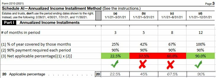 Can someone explain where the pre-filled applicable percentage on line 10 of form 2210 Schedule AI comes from? See snippets below. I think the IRS takes 90% of the period and puts the % there. For example, column (a) is 3 months. That is 25% of a year. Take 90% of that, and you get 22.5%. That checks. It also works for column (d). However, column (b) doesn't work. (b) is 5 months. That is 42% of a year. 90% of that is 38%, but the IRS pre-fills in 45%. Same issue in column (c). The result is columns (b) and (c) will artificially tell you to pay more than you really are supposed to. Someone tell me if I have this wrong. Thanks for the help.
