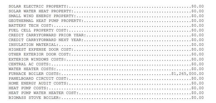 However after eFiling, I checked my Record of Account on the IRS website. The section for Form 5695 shows $1,265,000 for "Furnace Boiler Costs". There is either an error on the TurboTax transmission to the IRS, or on the IRS side. I tried to report this through the help line, however the agent did not know how to open a case on a program error.