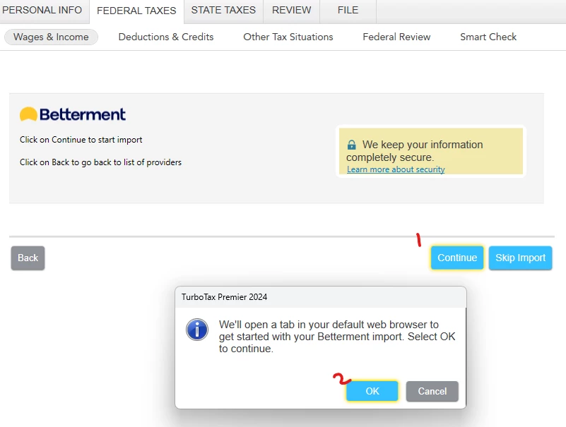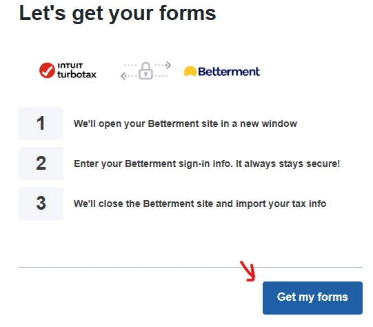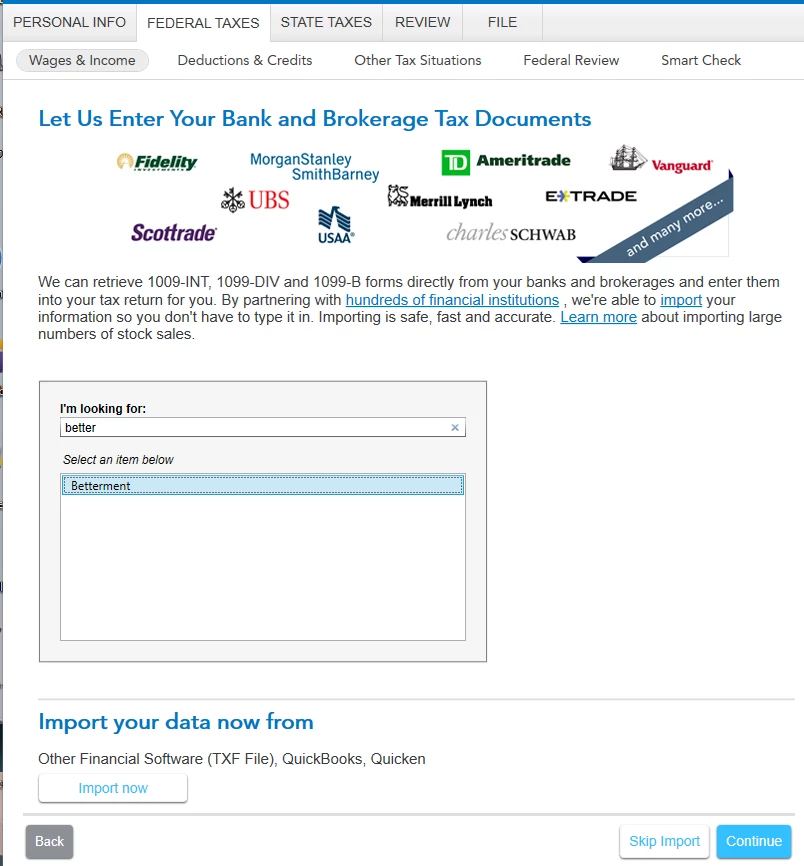 - Under Federal Taxes -> Wages and Income -> Let Us Enter Your Bank and Brokerage Tax Documents, I selected Betterment as the institution and clicked Continue.