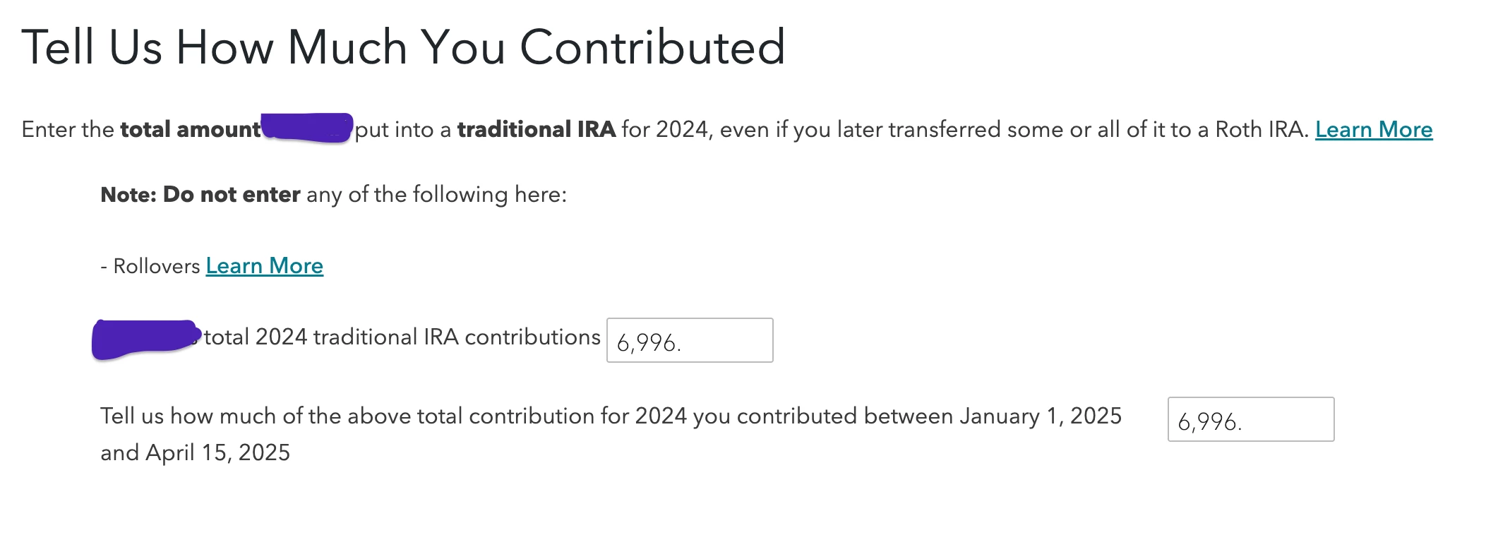 6. In March 2025 , I contributed $6996 to a the traditional IRA account for 2024