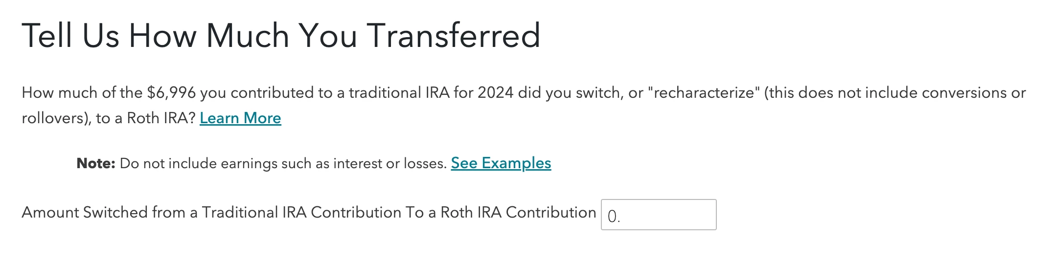7. During tax filing for 2024, I answered this question "Tell us if you moved the money through a rollover or conversion" with "I converted some or all of it to a Roth IRA"