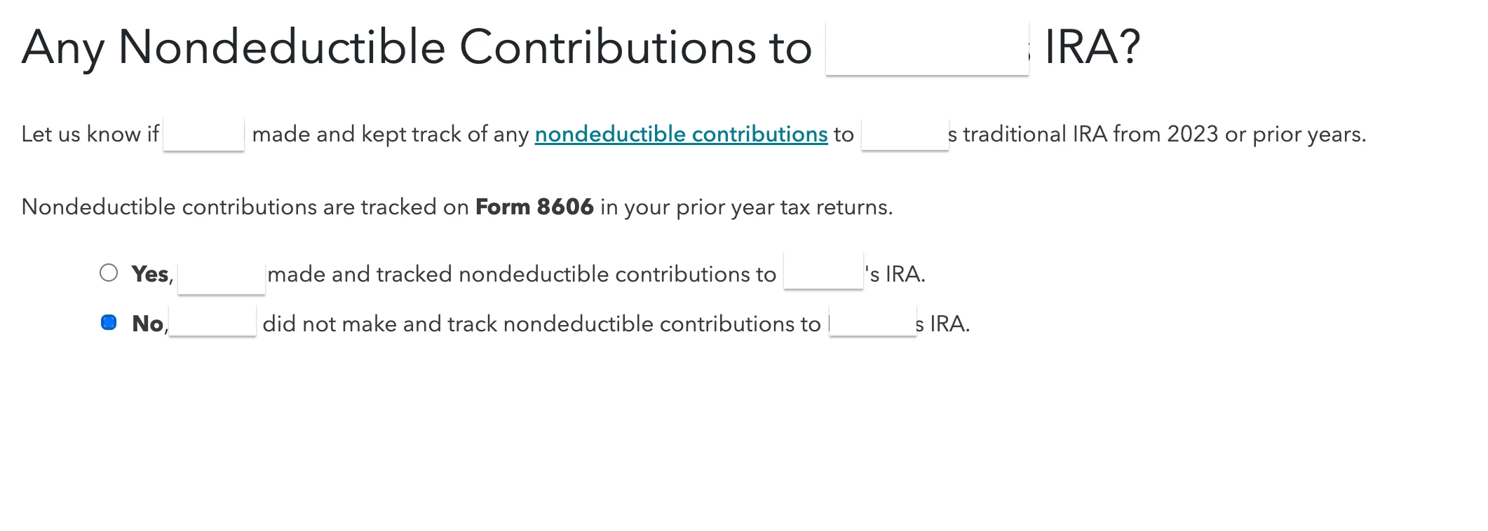 9. On the following screen, I am asked "Any Nondeductible Contributions to your IRA?" -- "Let us know if you made and kept track of any nondeductible contributions to your traditional IRA from 2023 or prior years.". The answer is "No, I did not make and track nondeductible contributions to my IRA."