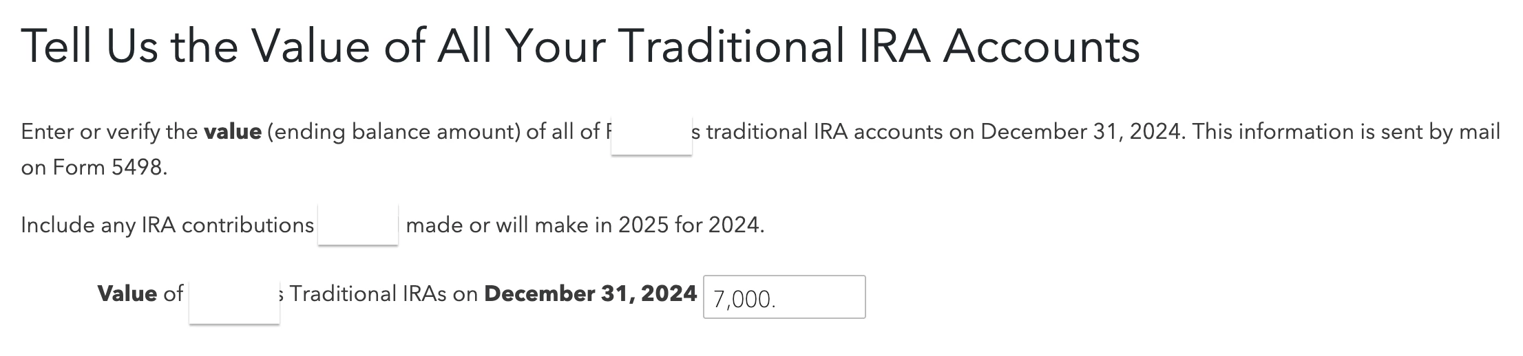 10. On the following screen - "Tell Us the Value of Your Traditional IRA". Value of all traditional IRA+SEP+Simple. The answer is $3.56. I see the taxable amount rise here which seems unexpected to me as I did a conversion from Traditional to Roth IRA