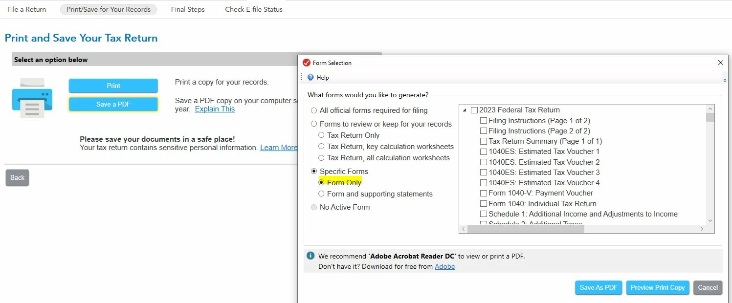 Form 3115 can be entered at TurboTax. but do not know how to print and save the form in PDF.