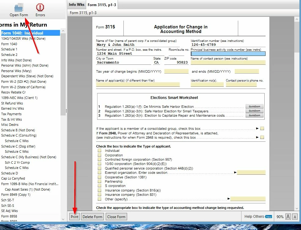 How come Form 3115 can be filled in at TurboTax desktop but can not be found in print and PDF?