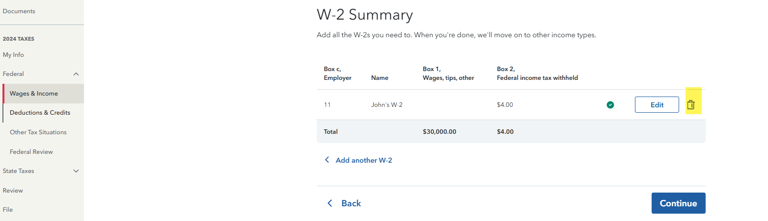 MmarymillsmillsForum|Forum|11 months agoApril 15, 2025QuestionHow do I remove a w2 from turbo tax?Forum|Forum|11 months agoApril 15, 20251 reply0 viewsI cannot find the delete to remove a w2TurboTax Free Edition Online