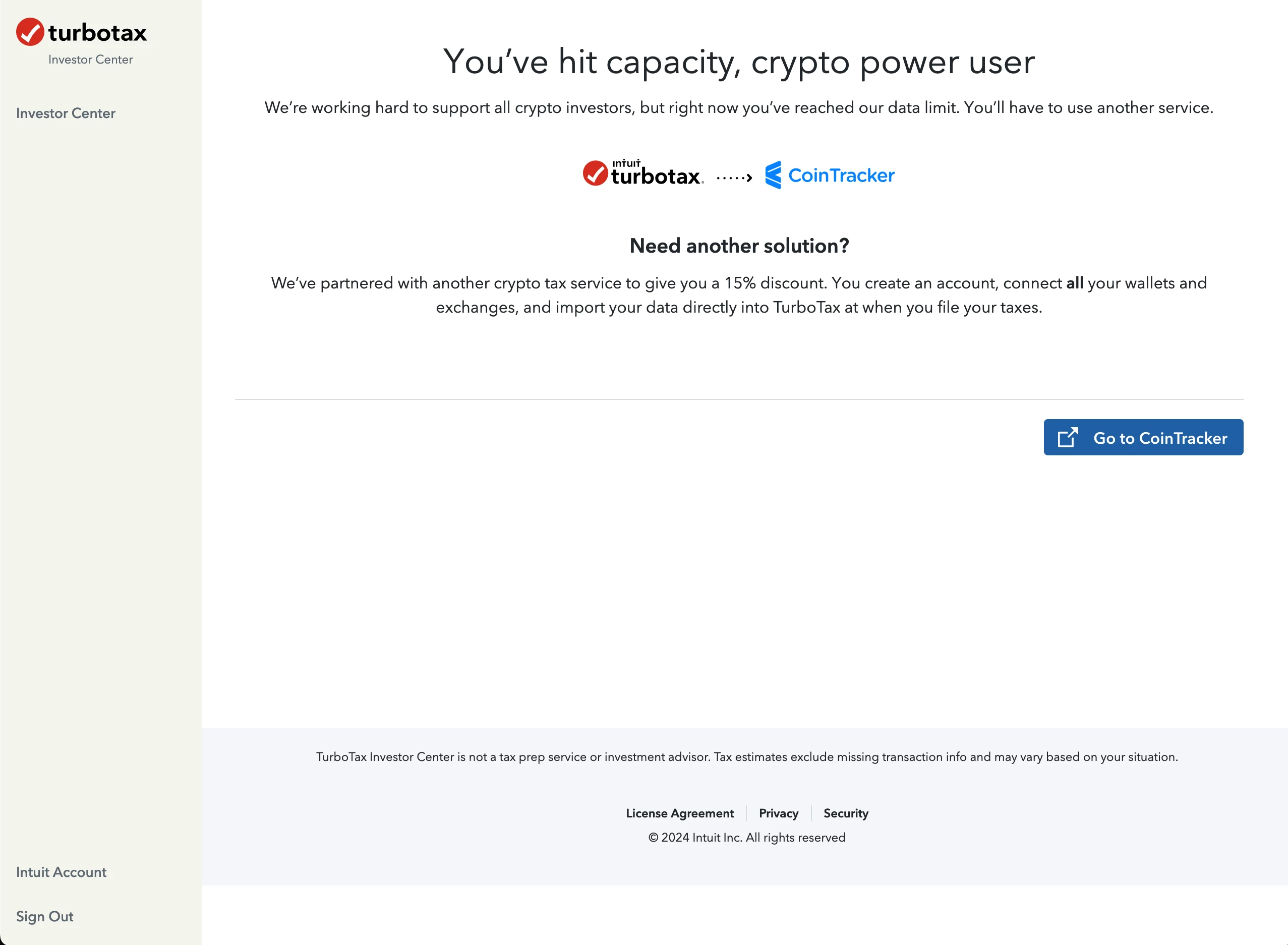 - I'm unable to delete my data because the Investor Center automatically shows the view "You've hit capacity, crypto power user"