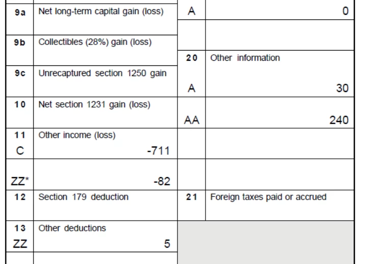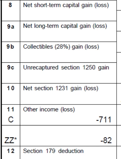 I checked Box D. The K-1 reports a Box 11 value of -711 and a ZZ code of -82.